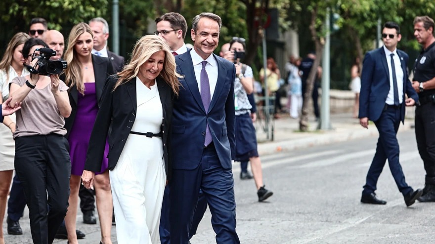 Ο Κυριάκος Μητσοτάκης μπήκε στο Προεδρικό Μέγαρο, κρατώντας το χέρι της συζύγου του Μαρέβας. Μαζί τους ήταν τα τρία παιδιά τους Σοφία, Κωνσταντίνος, Δάφνη.