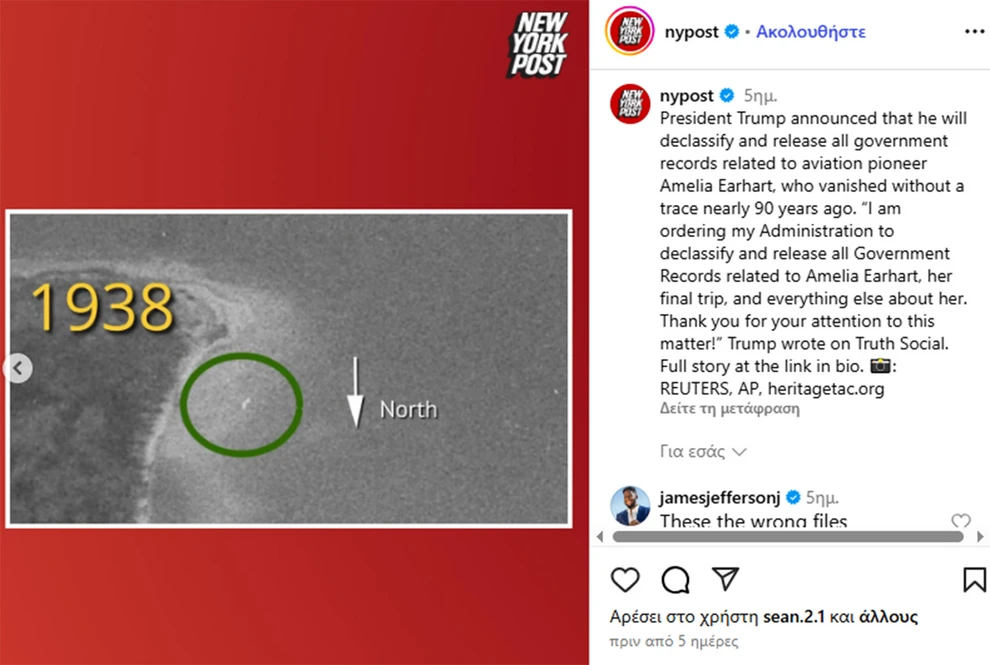Νεοανακαλυφθείσες αεροφωτογραφίες του 1938, που απεικονίζουν ένα μυστηριώδες αντικείμενο σε απομακρυσμένο νησί του Νότιου Ειρηνικού, ενισχύουν τις εκτιμήσεις ερευνητών ότι πρόκειται για το χαμένο αεροπλάνο της Αμέλια Έρχαρτ και μπορεί να αποτελέσουν το «κλειδί» για τη λύση της υπόθεσης.