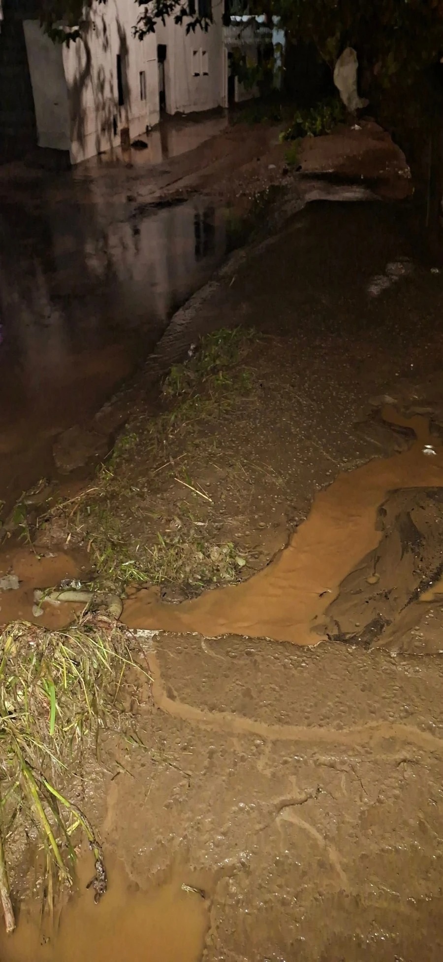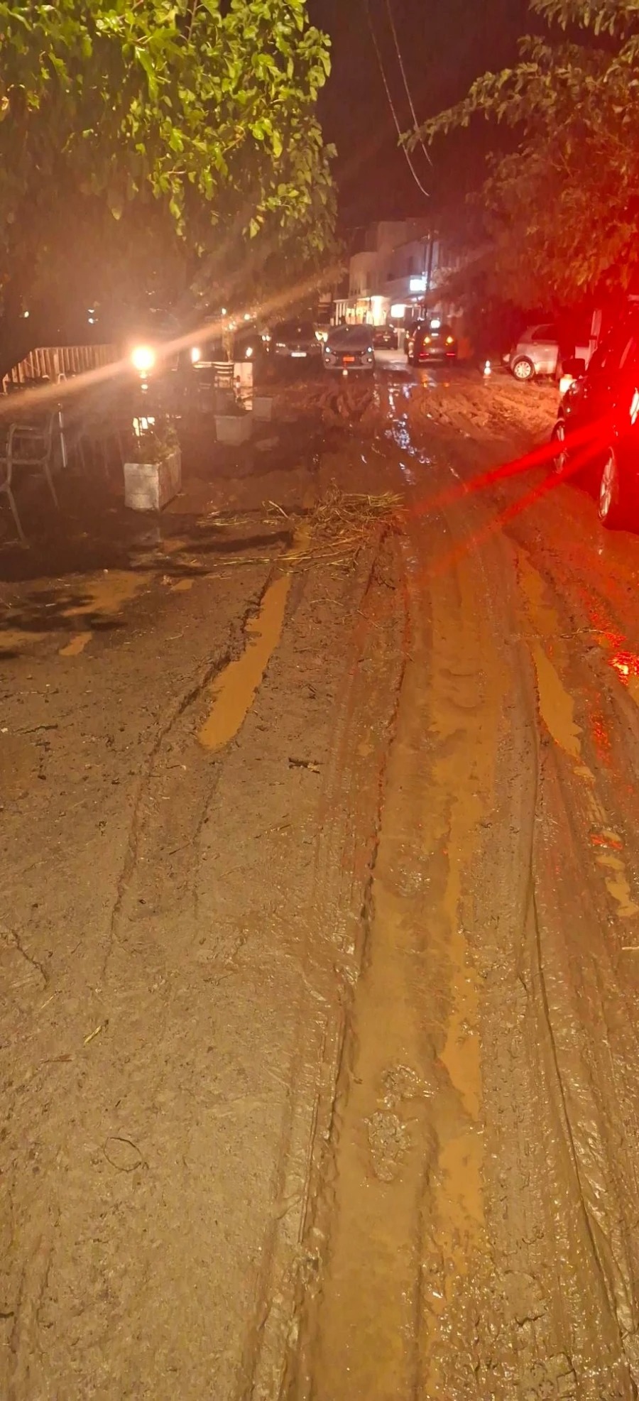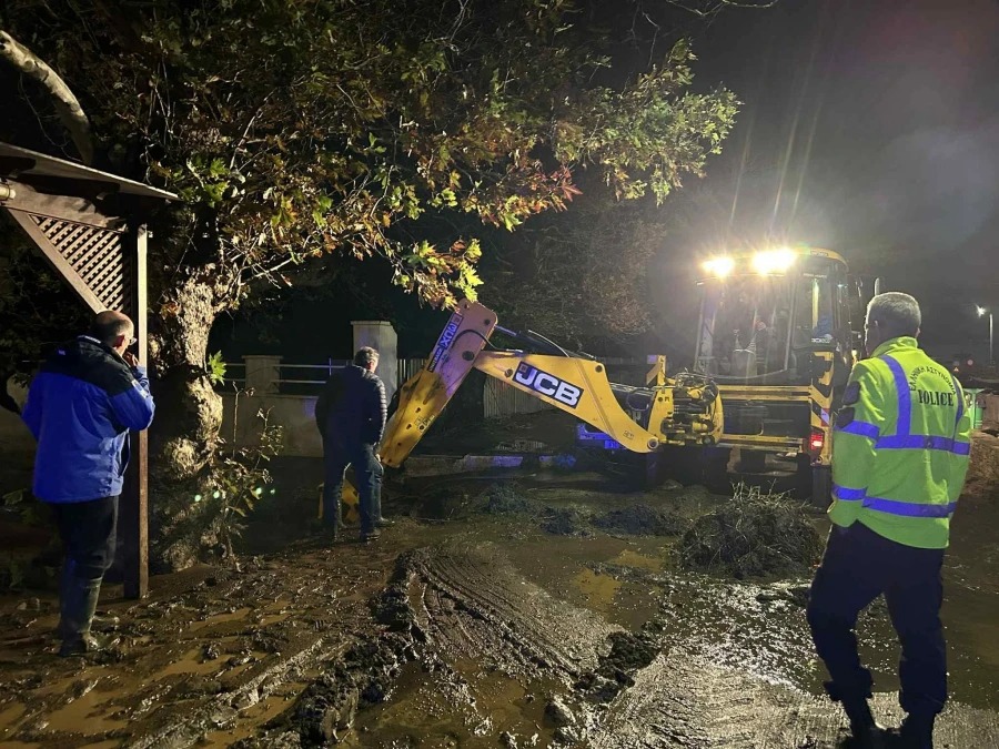 Η ξαφνική, ισχυρή νεροποντή προκάλεσε την υπερχείλιση του τοπικού χειμάρρου, που μετέφερε φερτά υλικά και μπλόκαρε την πρόσβαση προς τη θάλασσα, με αποτέλεσμα οι δρόμοι να καλυφθούν από μεγάλες ποσότητες λάσπης.