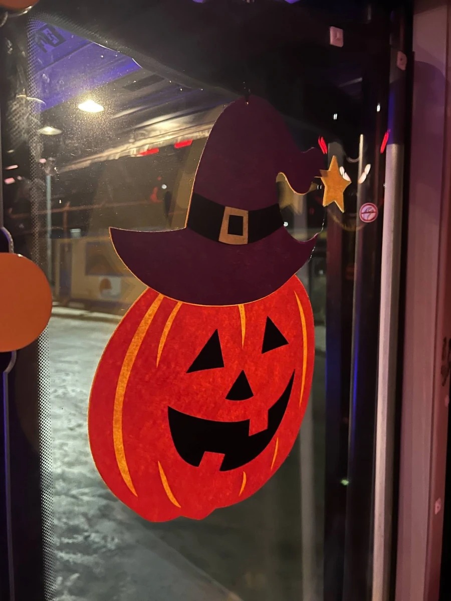 Το λεωφορείο έχει ντυθεί στα πορτοκαλί και στα μαύρα, με ιστούς αράχνης, σκελετούς, νυχτερίδες