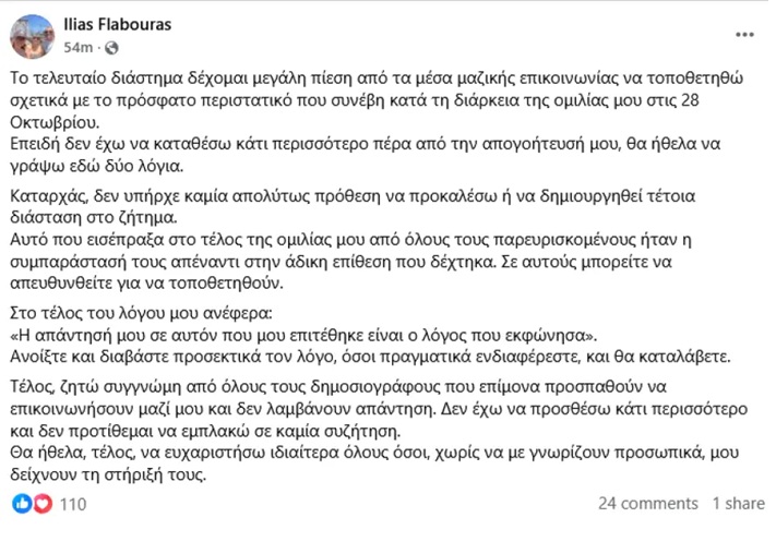 «Το τελευταίο διάστημα δέχομαι μεγάλη πίεση από τα μέσα μαζικής επικοινωνίας να τοποθετηθώ σχετικά με το πρόσφατο περιστατικό που συνέβη κατά τη διάρκεια της ομιλίας μου στις 28 Οκτωβρίου.