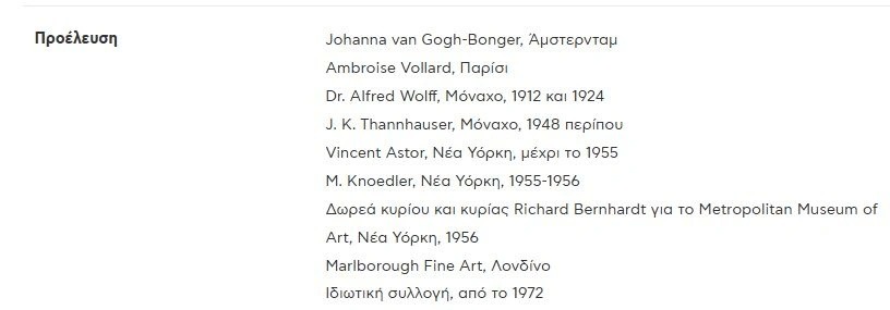 Το Ίδρυμα Βασίλη και Ελίζας Γουλανδρή δεν ανταποκρίθηκε σε αίτημα των New York Times για σχολιασμό. Σύμφωνα με την αγωγή, στο διαδικτυακό αρχείο του μουσείου δεν υπάρχει κάποια αναφορά στην οικογένεια Στερν, παρά μόνο στους μεταγενέστερους ιδιοκτήτες του πίνακα. Στην ιστοσελίδα του Μουσείου, αναφορικά με την προέλευση του έργου, αναφέρεται: «Johanna van Gogh-Bonger, Άμστερνταμ, Ambroise Vollard, Παρίσι, Dr. Alfred Wolff, Μόναχο, 1912 και 1924, J. K. Thannhauser, Μόναχο, 1948 περίπου, Vincent Astor, Νέα Υόρκη, μέχρι το 1955, M. Knoedler, Νέα Υόρκη, 1955-1956, Δωρεά κυρίου και κυρίας Richard Bernhardt για το Metropolitan Museum of Art, Νέα Υόρκη, 1956. Marlborough Fine Art, Λονδίνο, Ιδιωτική συλλογή, από το 1972».
