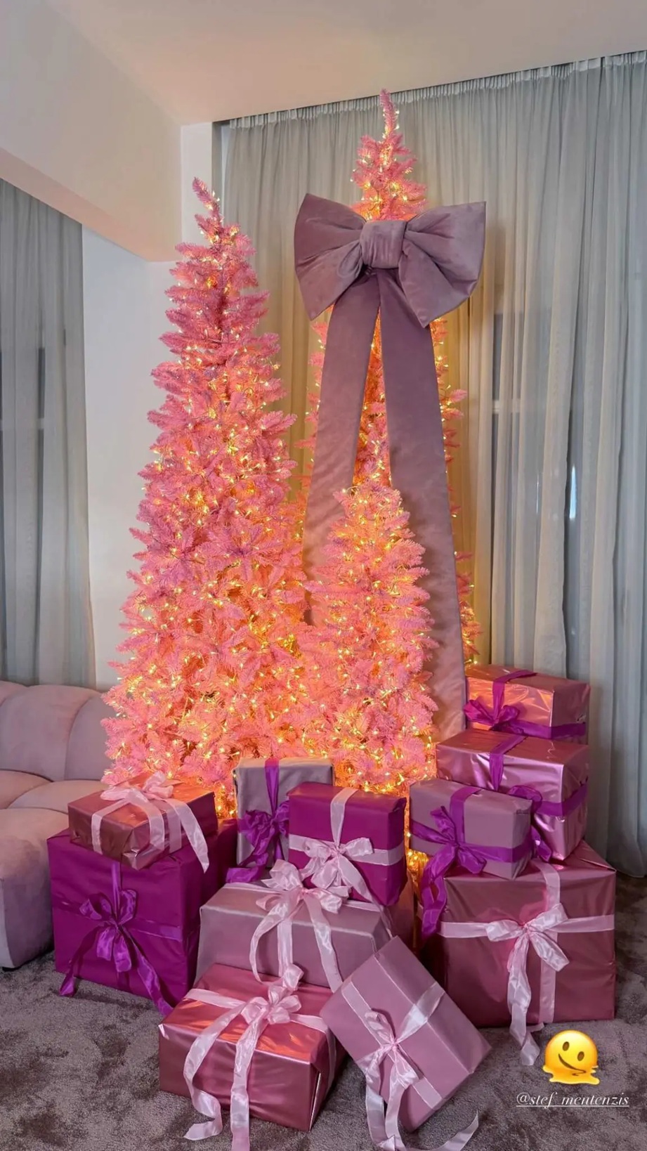 Η Ιωάννα Τούνη λοιπόν, επέλεξε τρία ροζ δέντρα στολίζοντάς τα μόνο με φωτάκια, και από κάτω στόλισε ροζ κουτιά δώρων.