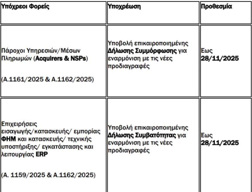 Περαιτέρω, καθορίζονται οι προθεσμίες συμμόρφωσης για τις εταιρείες τεχνολογίας και πληρωμών, ως εξής: