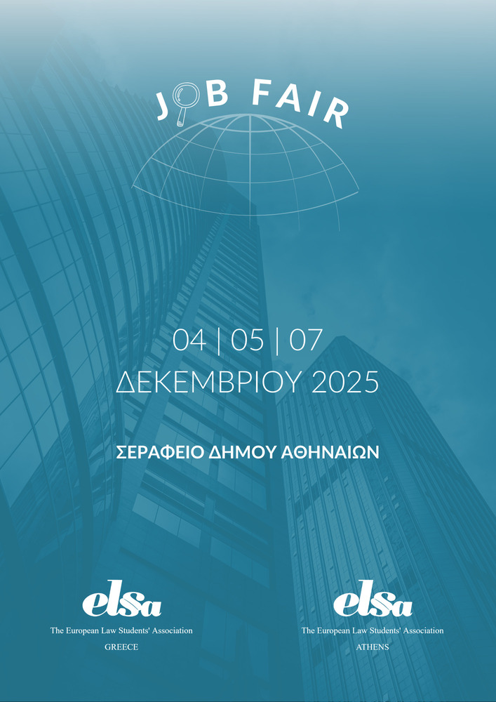 Η European Law Students’ Association (ELSA) Athens και η ELSA Greece σας προσκαλούν στο Job Fair που διοργανώνουν από κοινού την Πέμπτη 4, την Παρασκευή 5 και την Κυριακή 7 Δεκεμβρίου 2025, στο Σεράφειο του Δήμου Αθηναίων.