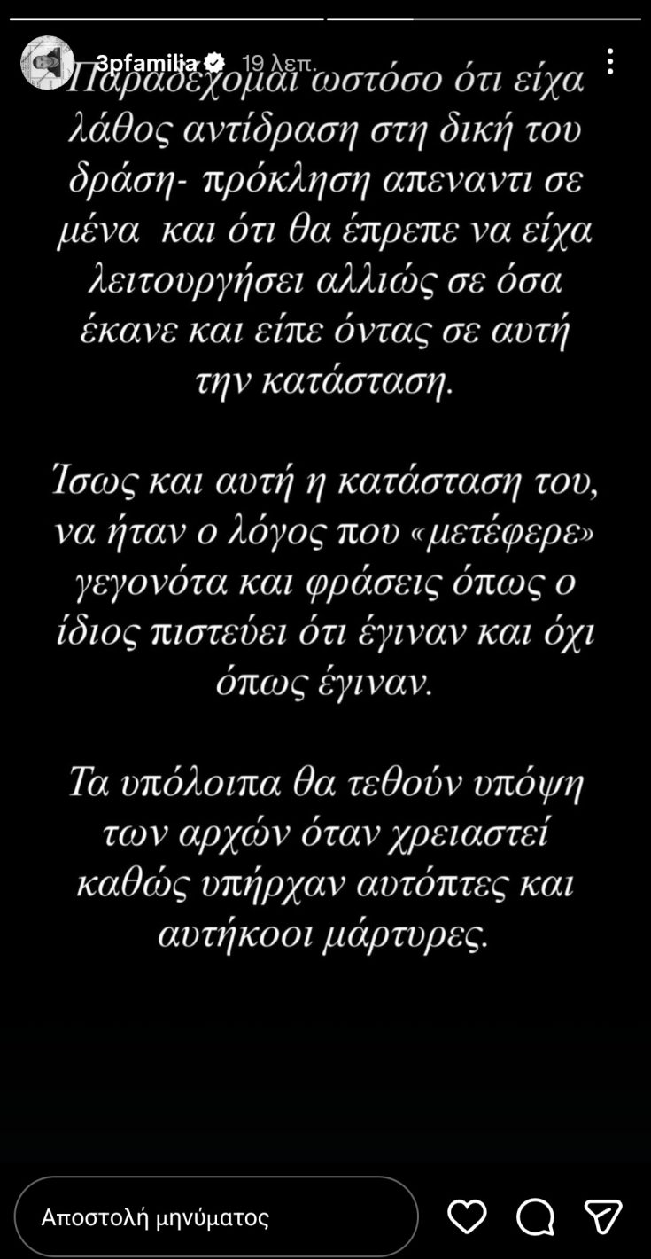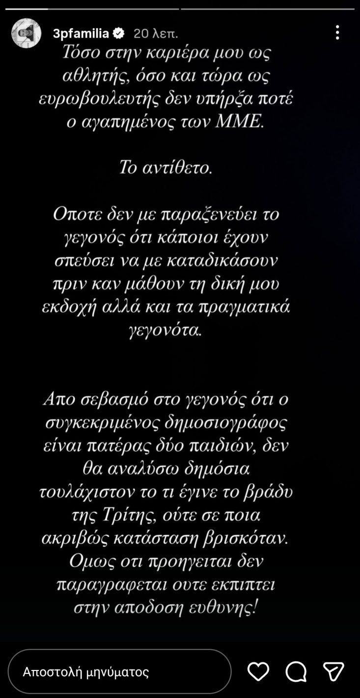 Σε story που ανάρτησε στα μέσα κοινωνικής δικτύωσης, ανέφερε ότι στην πορεία της καριέρας του, τόσο ως αθλητής όσο και ως ευρωβουλευτής, δεν υπήρξε ποτέ «αγαπημένος των ΜΜΕ», υποστηρίζοντας πως κάποιοι έσπευσαν να τον καταδικάσουν χωρίς να ακούσουν τη δική του πλευρά.