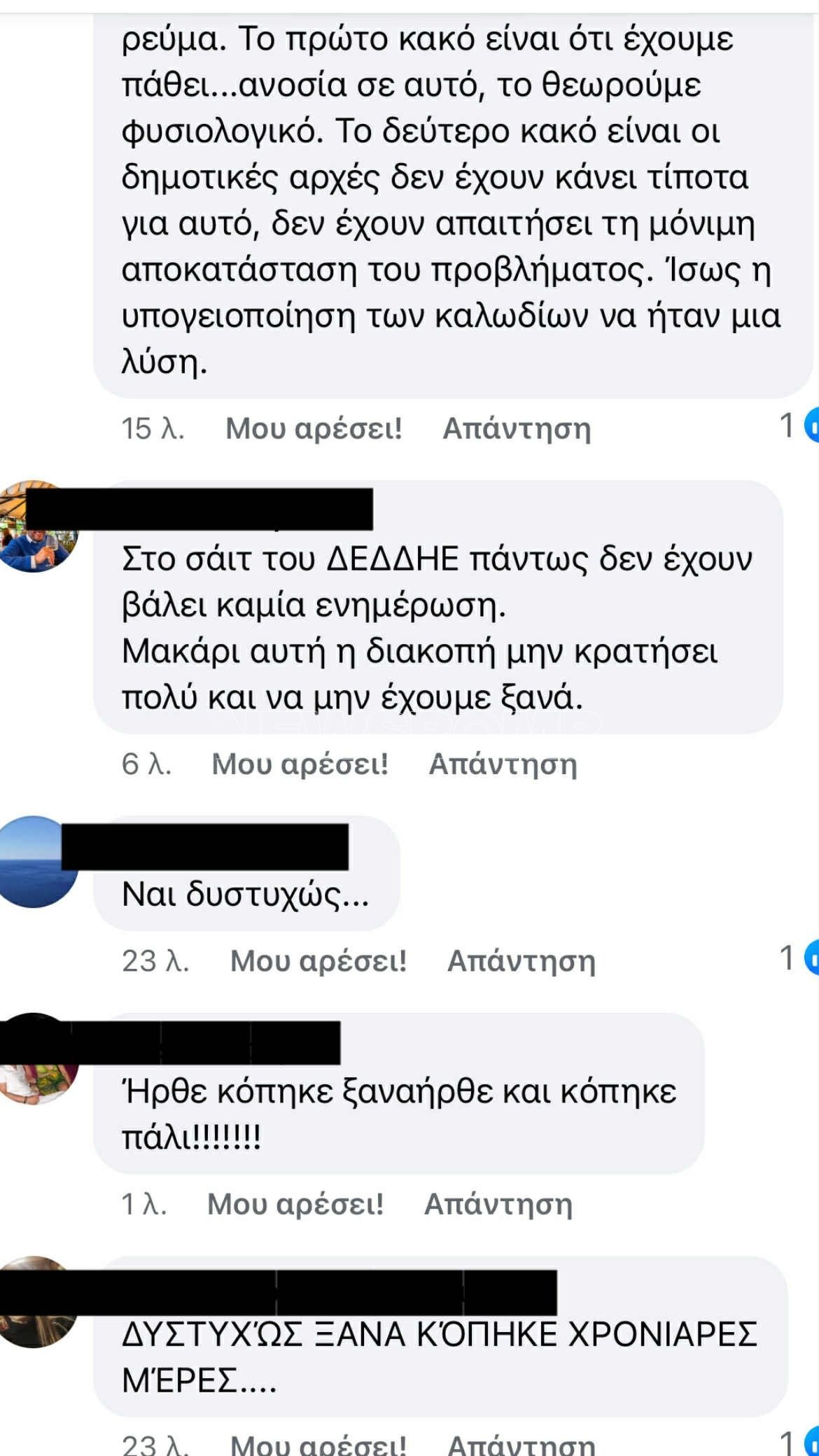 Η διακοπή ρεύματος προκάλεσε άμεσες αντιδράσεις στα μέσα κοινωνικής δικτύωσης, με κατοίκους να εκφράζουν την αγανάκτησή τους σε ομαδική σελίδα της περιοχής στο Facebook, αναρωτώμενοι γιατί ο Δήμος έμεινε χωρίς ρεύμα: «Ξανά… κόπηκε… δυστυχώς», αναφέρει χαρακτηριστικά κάτοικος, ενώ άλλοι κάνουν λόγο για επαναλαμβανόμενο πρόβλημα. «Με την πρώτη κακοκαιρία μένουμε χωρίς ρεύμα, το έχουμε πλέον συνηθίσει», σημειώνει άλλος χρήστης, εκφράζοντας προβληματισμό για την απουσία μόνιμων λύσεων.