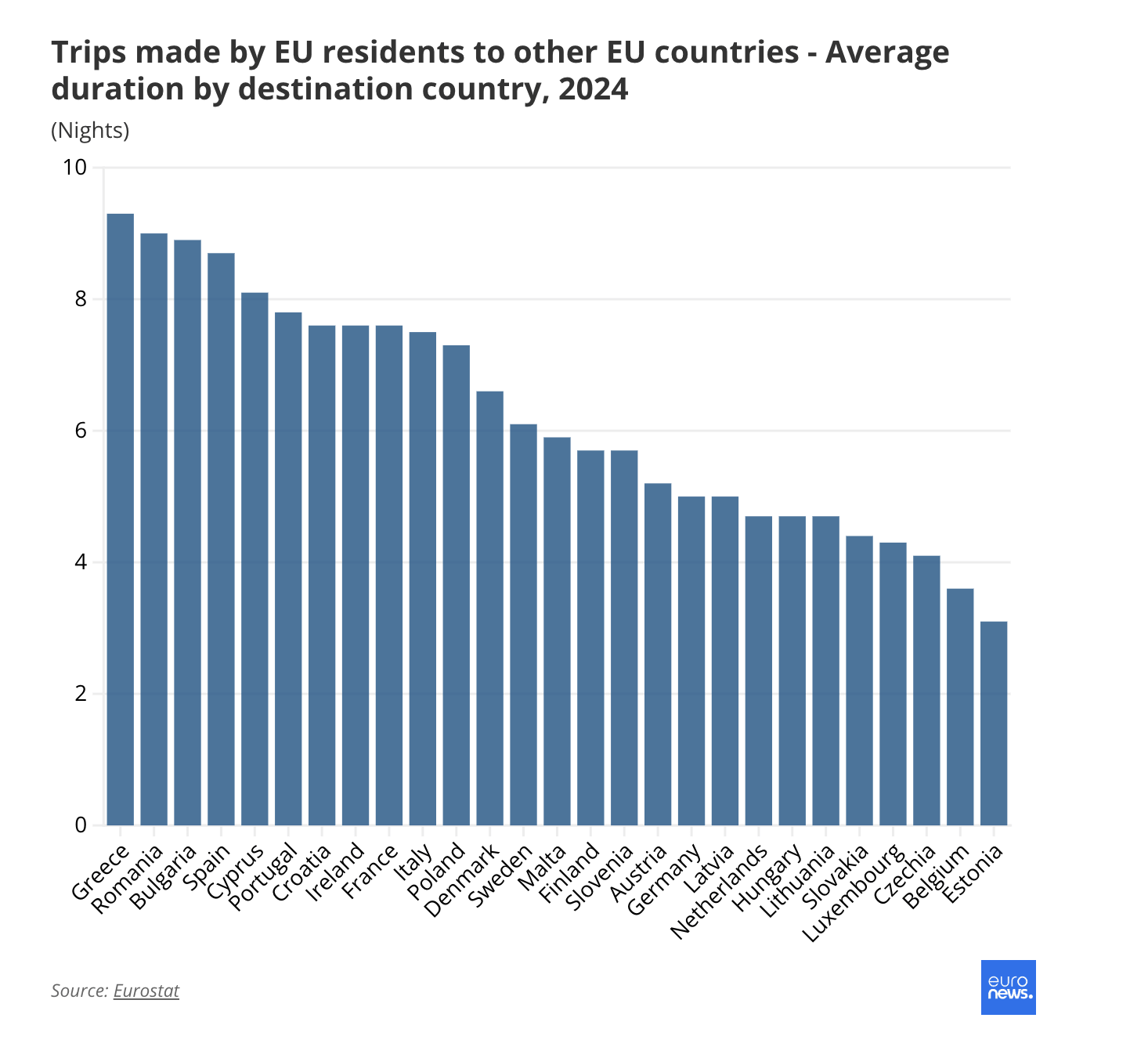 Ανάμεσα στους προορισμούς που ξεχωρίζουν, η Ελλάδα καταλαμβάνει την πρώτη θέση. Οι επισκέπτες από άλλες χώρες της Ένωσης παρέμειναν κατά μέσο όρο πάνω από εννέα διανυκτερεύσεις, επίδοση που τη φέρνει στην κορυφή της σχετικής κατάταξης. Αντίστοιχα υψηλή διάρκεια διαμονής καταγράφεται και στη Ρουμανία, επιβεβαιώνοντας ότι οι τουρίστες επιλέγουν να μένουν περισσότερο σε χώρες που προσφέρουν ποικιλία εμπειριών και φυσικών τοπίων.