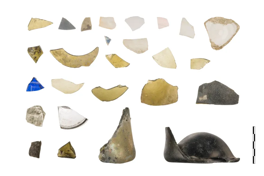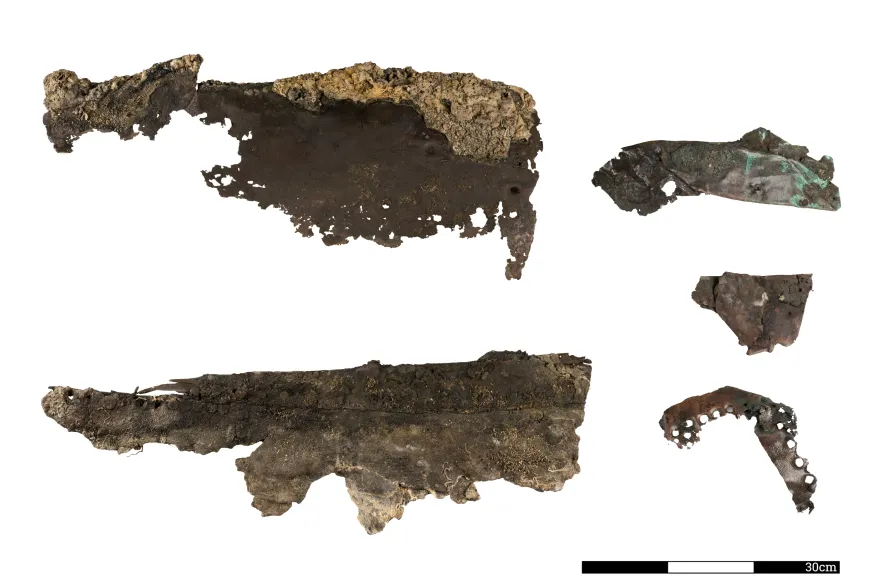 Αν και κατά την ανασκαφή της τομής (εικ. 5-6) δεν εντοπίστηκαν θραύσματα νομέων από το πέτσωμα του πλοίου, εντούτοις εντοπίσθηκαν αντικείμενα προερχόμενα από τον εξαρτισμό του, καθώς και θραύσματα σκευών καθημερινής χρήσης (εικ. 7 α - β). Ακόμα εντοπίσθηκαν θραύσματα από την εξωτερική επιχάλκωση του πετσώματος του πλοίου.