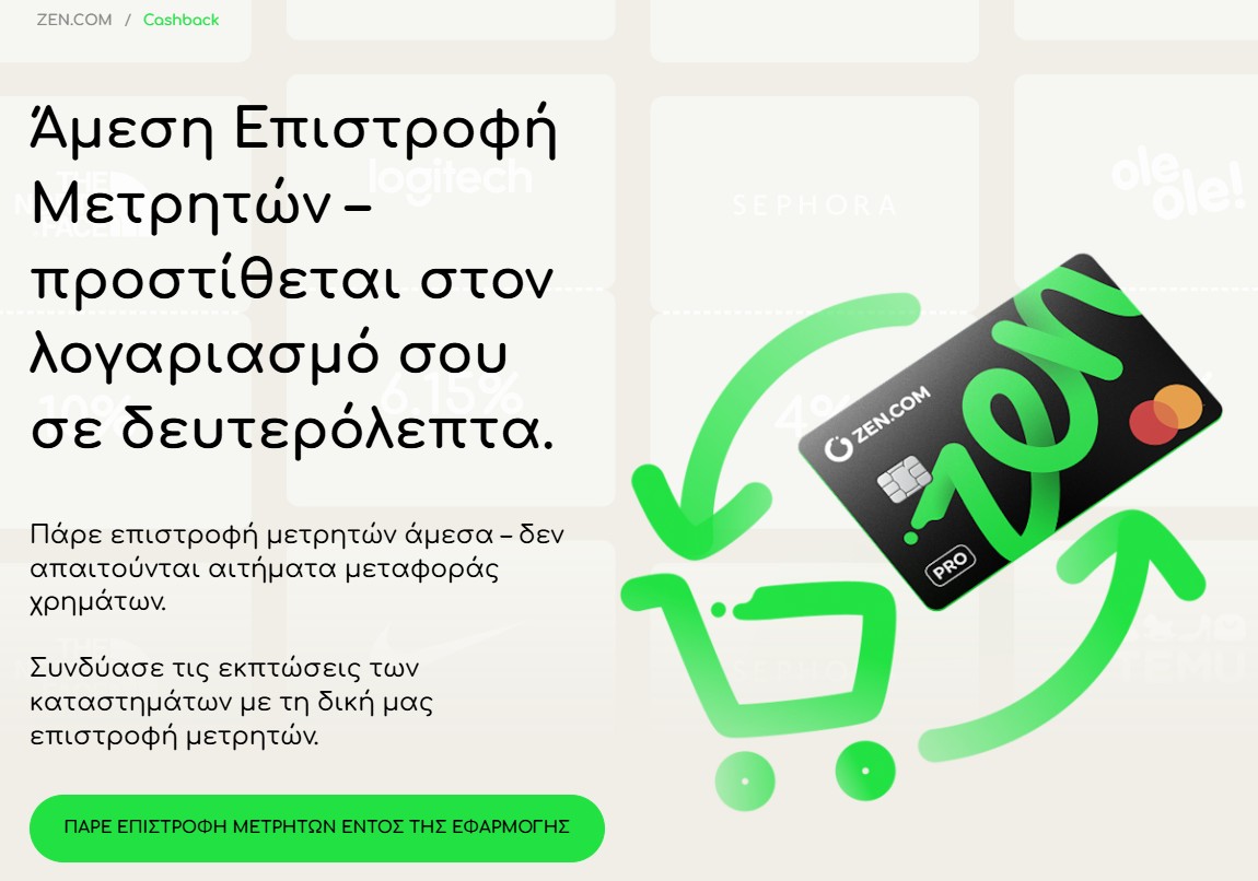 Η ZEN.COM δημιουργεί ένα οικοσύστημα αγορών που ανταμείβει τους χρήστες, δίνοντας τους τη δυνατότητα να αγοράζουν από αγαπημένα καταστήματα και ταυτόχρονα να κερδίζουν άμεσα cashback.