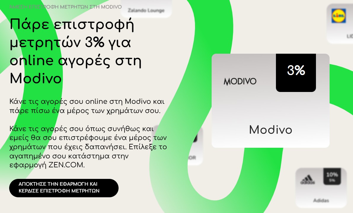 Ένα χαρακτηριστικό παράδειγμα είναι το https://www.zen.com/gr/cashback/modivo/, όπου οι χρήστες μπορούν να απολαμβάνουν επιπλέον επιστροφή χρημάτων στις αγορές τους. Με αυτόν τον τρόπο, κάθε αγορά μετατρέπεται σε μια ευκαιρία εξοικονόμησης.
